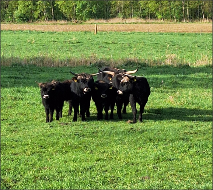 TIERE Unsere "Auerochsen" stehen ausschließlich im Zuchtbuch A des VFA (Verein zur Förderung der Auerochsenzucht e.V.). Wir legen Wert auf inzuchtfreie Tiere; deswegen halten wir unsere "Auerochsen" zeitweise in zwei Herden. Die vorgeschriebenen Blutuntersuchungen zur Tierseuchenbekämpfung sind bereits gemacht oder werden bei Verkauf vorher noch durchgeführt. Preise nach Absprache. Der Transport kann von uns übernommen werden. Alle Tiere sind Bio zertifiziert.