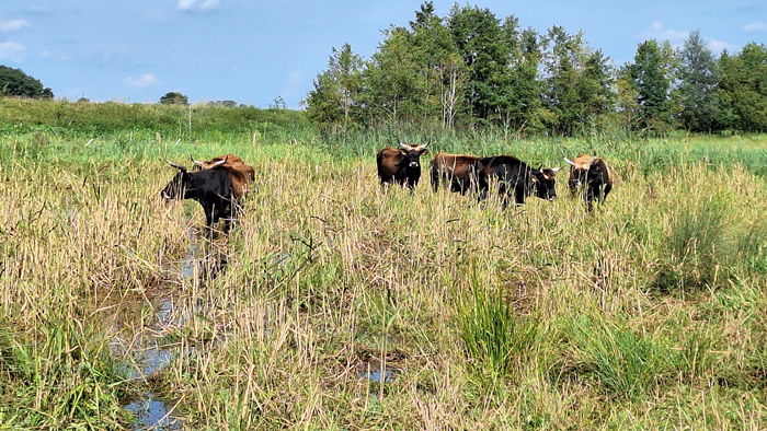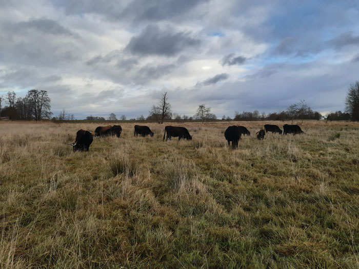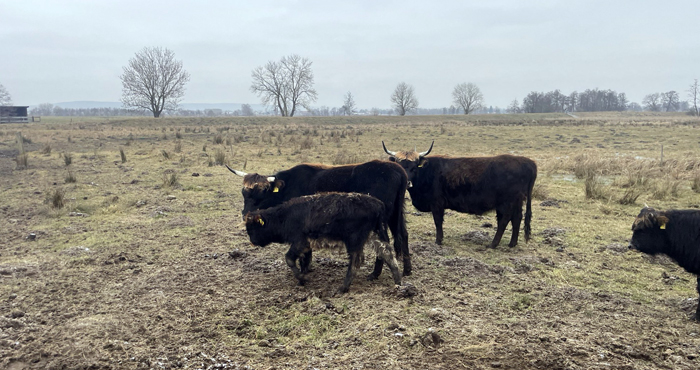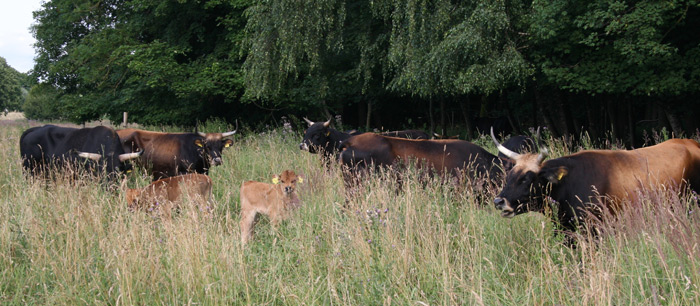 Alle Tiere werden im Zuchtbuch A des "Vereins zur Förderung des Auerochsen" - VFA e.V. geführt und verfügen über einen nachweisbaren Stammbaum. Unsere 23 "Auerochsen" werden auf 20 ha Weidefläche gehalten. Sie leben in einem sozialen Herdenverband mit einer Leitkuh, dem Deckstier, den Jungstieren und Mutterkühen mit ihren Kälbern. Bis zur Geburt der nächsten Generation (ca. 1 Jahr später) bleiben alle Kälbchen bei ihren Müttern und werden so lange noch gesäugt. Nach dem Absetzen kommen die weiblichen Jungtiere in die "Damengruppe". So vermeiden wir Inzucht. Die Bindung zwischen Mutter und Kalb ist auch nach sieben Monaten sehr stark. Da Auerochsen verhältnismäßig spät geschlechtsreif werden, können wir die Jungstiere bis zum 10. oder 12. Lebensmonat bei den Kühen lassen. Der weibliche Nachwuchs verbleibt in der Mutterkuhgruppe.